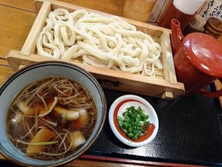登場した『肉汁うどん(小)冷もり』は太くてごっつい麺で色も茶色がかっており、いかにも地粉という雰囲気。肉汁は肉が見えませんが器の下に沈んでいました。うどんはじっくり1本づつ噛み締めていただきます。肉汁はあまり特徴はありませんが、家庭的な味で安心できる美味しい味です。