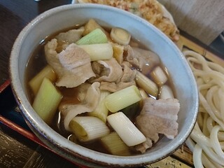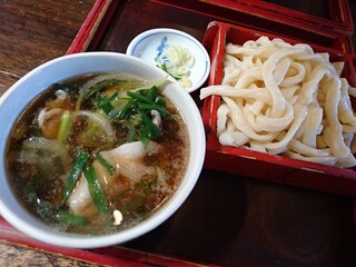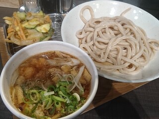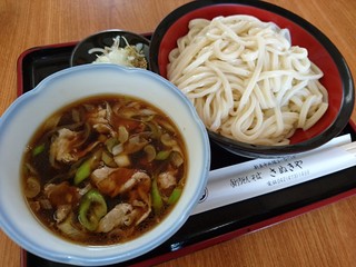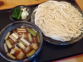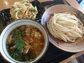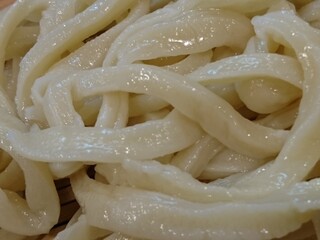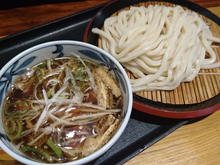 うどんは白くてエッジが効いており手打ちではなく機械打ちだと思われます。噛みしめるほどコシはなく、喉越しで食べるのはごっつい感じ。つけ汁には豚肉やネギなどがゴロゴロ入っており、味は少し甘みを感じるレベルで普通においしいです。 コストパフォーマンスのレベルは高いです。