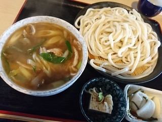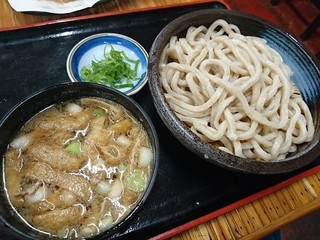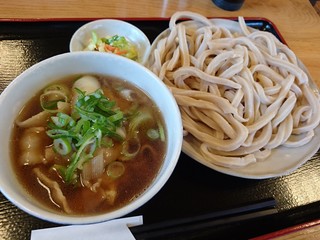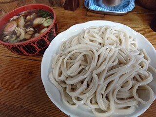 皿が大きいので麺の量は多く見えませんがそこそこあります。うどんは少し茶色めで普通の太さ、食べてみると「すいとん」を連想させる味でおいしいです。噛みしめる感じでもなく、喉越しで食べるほど柔らかくもなく中間的な硬さです。つけ汁は豚肉もしっかり入っており珍しくナルトも入っています。総合的には美味しい「武蔵野うどん」です。