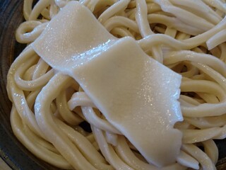 「うどん」は色が黒めでごっつくて短く手打ち感満載です。食感がモチモチで肉汁にマッチします。(中)は確か400gという説明でしたが、ちょうど良い量です。「かき揚げ」は素材を大きめにザックリ刻んだものでまぁ普通です。