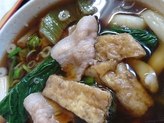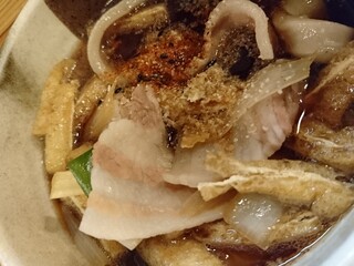 『かき揚げ』は大き目で揚げたての熱々。「うどん」は地粉らしく表面にブツブツ見えるタイプですが、硬くもなく柔らかくもなく中間的な硬さ。肉汁は正直「豚肉」は少なく、やたら「油揚げ」が多めです。