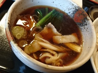 うどんは色がかなり濃く、今まで食べた武蔵野うどんの中では一番黒いイメージです。また固さも強烈でしっかり噛みながら食べるうどんです。肉汁の味は標準的なもので肉があまり見えませんでしたが器の中に沈んでいました。