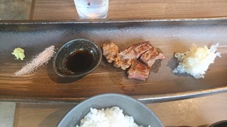 格安で高級牛を少量から頼めるこの店、ありです。安い50gのステーキを数種類頼み、みなでシェアする事とする。倉石牛がダントツで一番美味い。