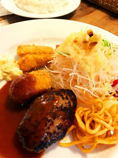 ハンバーグ、エビクリームコロッケ、サーモンフライ、ご飯大盛、こちらはご飯が美味しい、ご飯屋さんでご飯が美味しいとポイント高いです。デミグラスソースとサーモンフライのタルタルソースも美味しい!やはりこちらの洋食は私の口に合う!