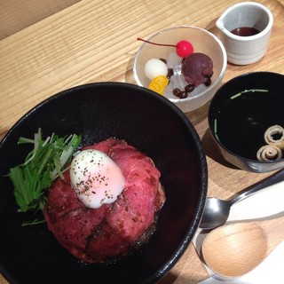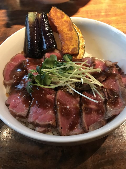 レアな焼き加減のステーキが薄くカットされご飯の上に乗っております。ナスとかぼちゃの薄切りを焼いた物も乗っております。ニンニクとバターの風味が口に広がり、お肉も柔らかくて食べやすい。ステーキ丼というよりローストビーフ丼に近い感じ。