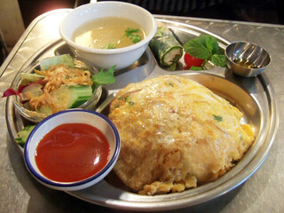 玉子をほぐすと中の具に豚挽き肉以外にトマトも入ってて本場の地味な色合いに対し彩りも綺麗で何だがお洒落。玉子もトロトロで日本のオムライスに調理加減は近いと思いました。別添えのチリソースも全部ドバーッとかけてみましたが、自分的にはさほど辛さは感じず、魚醤の匂いも抑え目で日本人向けアレンジタイ料理かなと思いました。豚挽き肉の旨味たっぷりでパクパクと食が進み、あっという間に完食しました。