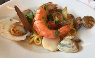 パスタ麺が隠れるほどの、たっぷりの魚介類を楽しめます。