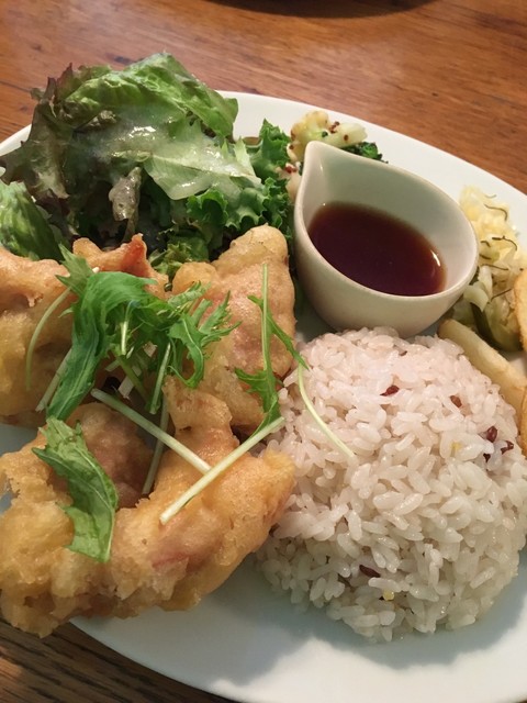 ご飯が十六穀ご飯で野菜が多く健康的なランチプレートでした。メインの唐揚げは衣が多くサクサクで食感が良かったです。天ぷらのように軽い衣でゆずポン酢で食べるのでヘルシーなから揚げで美味しかったです。次回はデザート系を食べに来たいと思います。