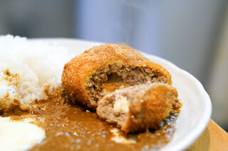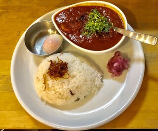 オーダーは勿論、ドライカレーオムレツのせ。中辛一本。マイルドな辛さで、普段甘口の私でも無問題。キーマとありますが、ドライなひき肉感はそれ程でもありません。上に、とろっとろの金色プレーンオムレツが輝いています。ご飯は炊きたての銀シャリで美味。