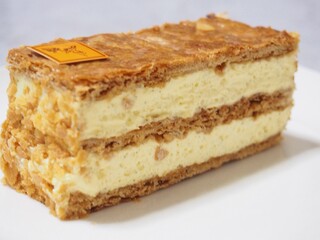 お店のスペシャリテは「ミルフイユ・ヴァニーユ」。フランスの伝統的なスイーツとして知られ、こだわりのクリームとサクサクのパイ生地が特長的。