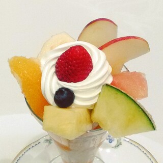 一度に色々なフルーツを食べるなら「銀座パフェ」がおすすめ。メロンやりんご、バナナなどが見事に盛り付けられています。