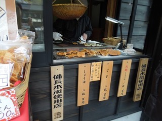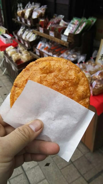 いかにも職人!って感じの、おじちゃんが、手際良く、網の上で焼かれてた1枚を紙に包んでくれました。隣で奥さんも一緒に焼いていて、ピッタリのリズムで次々御煎餅が出来上がります。その奥さんにお支払いをして、店横にある縁台で、いただきまぁす!