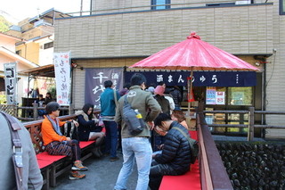 暖簾や大幕に大きく『酒まんじゅう』と書かれてる通りでありますが、私が好きなのは『そばだんご』!コレ美味しくて、高尾山に来たら必ず食べる程なんです。目の前の川に掛かる橋の上の縁台で食せば、うーん、なんと風情あるコト。遠くに見える紅葉が一層、味わい深く。