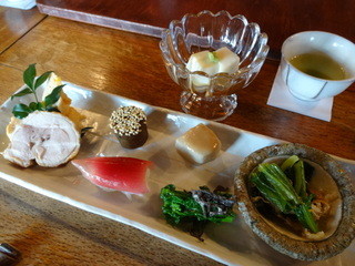 前菜八種・梅香蒸し・焼物・揚物・御食事(炊き込みご飯、麺類等)・サラダ・クリームあんみつのコースになります。コースでは一番安いものなのですが、十分に楽しめて満足できるものでした。お店の雰囲気だけでなく、料理が美味しい~♪