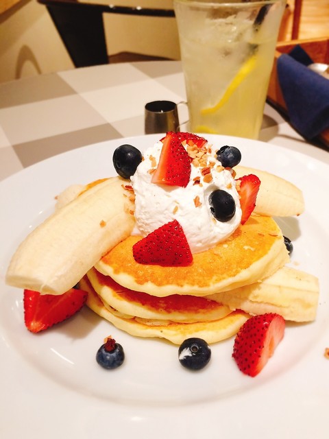スイーツ系メニューでは、イチゴやバナナをトッピングしたパンケーキが人気のようです。