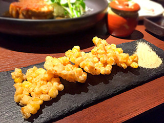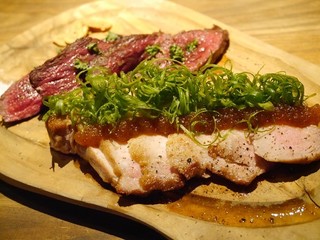 「和牛もも肉の瞬間燻製」980円は、カウンターから厨房を覗いたら「網onの和牛」が燻されていました。より、お肉旨みが増しますね!溶き卵入りタレにたっぷりつけて。ゴハンがほしくなる美味しさ。