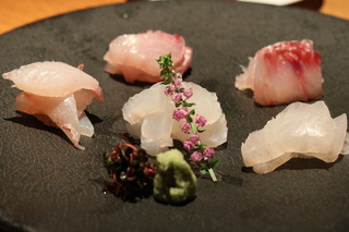 ラインナップは、肝が乗せられたカワハギ、金目鯛、しまあじ、ヒラメ、アオリイカ、かます、炙りたちうお、炙りのどぐろの8種。その場で摩りおろす山葵が香り高く良かったです。