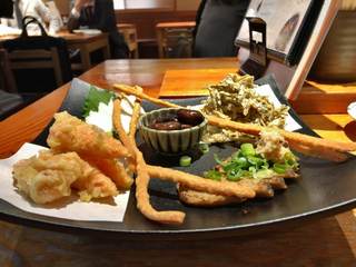 ディナータイムにおすすめしたいのは「たらふく讃岐盛」。これは香川県讃岐の味が存分に楽しめる一皿で、じゃこ天・揚げうどん・海老ちくわなどがのっています(内容は日によって異なります)。