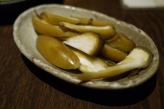 四角い七輪で、お店の方が焼いてくれる。帆立は肝の部分ははずしてあり、ひもと貝柱で提供される。だいたいよい頃合いになったときに、たれをじゅうっとかけながらさらに焼いていただく。貝柱は甘味がのっており、その日の店長のお勧めの焼きものだった。