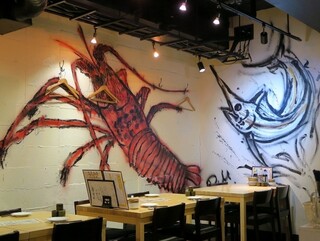 【俺の魚を食ってみろ!! 神田本店】という、勢いが感じられる屋号の居酒屋。店内の壁画もインパクト大!お店へ入るだけで、何だかワクワクしてきそうです。