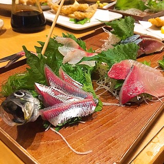 サワラにイサキ、真鯛やニシ貝など旬の魚がお皿の上に並びます。酢味噌で味わうキビナゴ刺しが用意されることも。