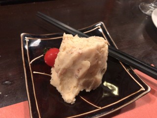 なめらかなポテサラ。酒盗が入っているおかげで塩味と旨味のバランスがすごく良い。それに胡椒のピリリ感がとっても合います。酒盗っぽいクセの強い味はうまい具合に隠れているから食べやすいですよ。