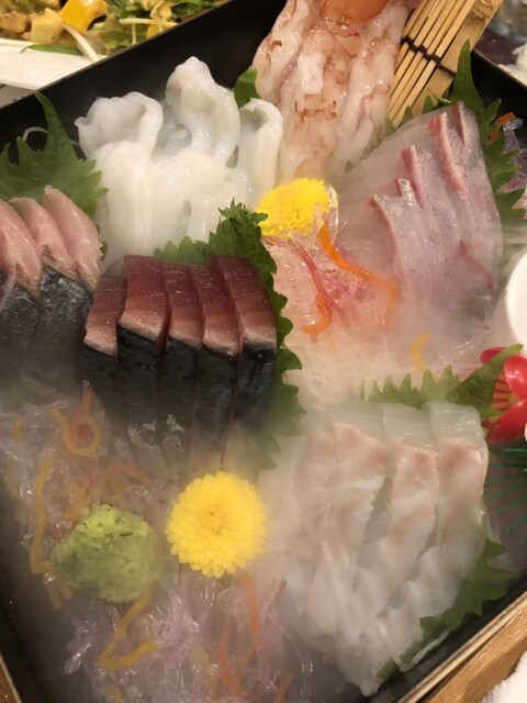 豪快に盛り付けられた「旬のお刺身盛り合わせ」。色々な季節の魚介を楽しめるのは良いことですね。