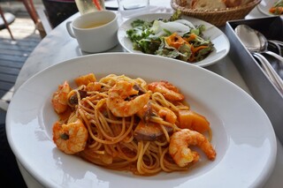 天井も高く賑やかな雰囲気は、ランチタイムが楽しくなりそう。天気が良い日には、テラス席でも食べられます。