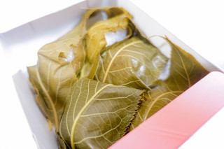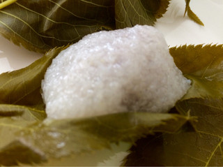 半年から1年かけて塩漬けした伊豆・大島方面の畑で獲れるオオシマザクラの若葉を使い大きさの異なる "道明寺糒(ほしいい)" を用いたお餅は漉し餡が上品な甘さで葉の塩気と見事にマッチ、さらにお餅の食感がすばらしい!