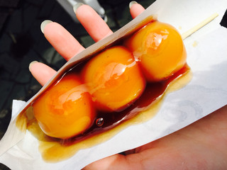 こちらの人気食べ歩きグルメは、ゆで卵の「赤にぬき」。