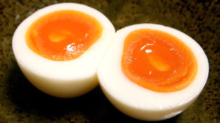特別濃厚卵である赤にぬきをゆでたシンプルな料理ですが、半熟の旨味たっぷりの黄身がたまらないとのこと。お店の前に卵を割るための石とふりかける塩があるそうです。