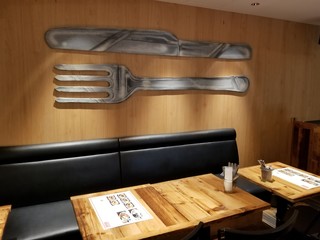 壁に飾られた大きなナイフとフォークも、インパクトがありますね。