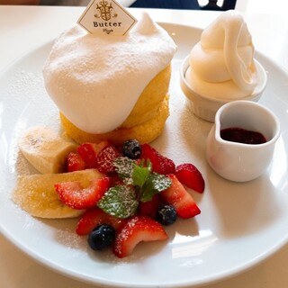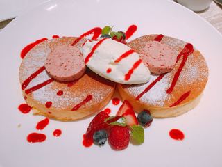 ぷるぷると揺れるほどのやわらかいパンケーキが特徴で、ミックスベリーのソースをたっぷりとかけて味わいます。