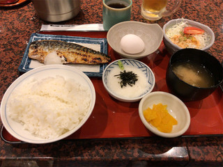 焼き魚はサバで、他に味噌汁、サラダ、とろろ、生卵、漬物、ごはんが付きます。味自体は標準的な域ですけれど、味噌汁は牛丼チェーン的なチープさは感じませんので価格的にも丁度いいとこかなと感じました。