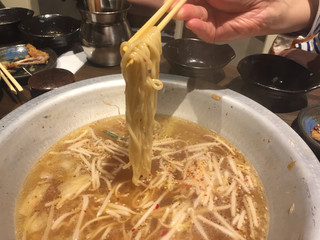 もつ鍋のもつはプリプリで、美味しかったです。もつ鍋にはもつの他に、キャベツ、ゴボウ、ニラ、豆腐などが入っています。もつは煮込みすぎると硬くなるので、注意が必要です。鍋の〆にチャンポン麺をオーダー。茹でられた麺を席まで持ってきてもらえます。