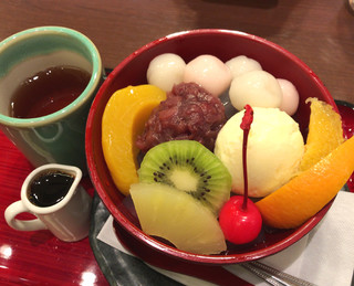 この日頂いたのは季節限定メニューの最高峰「スペシャル氷みつ豆」。食べ進むうちにどんどん冷えてくる舌と体を、温かいほうじ茶で休めながら最後まで美味しく頂けましたわ♪上品に美味しかったです!ほうじ茶はちょくちょく注ぎに来てくれましたよ(^^)