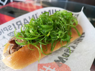 伏見稲荷限定九条ねぎ牛パン注文。程よく温まったコッペパンに牛肉と塩味のタレがついた九条ネギが大量にトッピングされてます。ジューシーな牛肉は甘めのタレで味付け、細くスライドされていて食べやすい。この合わせは絶対美味いよね…!