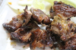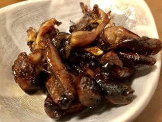 焼いたウズラをタレ壷にくぐらせ、さらに焼くという焼き方で、たっぷりとタレがついた香ばしい風味です。仕上げに山椒がまぶされていました。串に刺さっていて、食べやすい感じになっていました。小骨や頭まで食べられるそうです。
