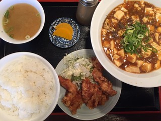 丼いっぱいの麻婆豆腐に、大ぶりな唐揚げ。ご飯は大盛りで、大満足のランチになること間違いなし!