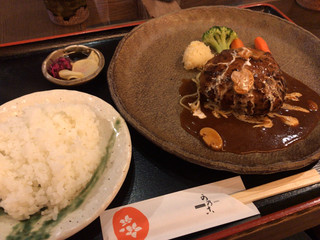 五品目・・桜餅風コロッケとご飯、香の物、コロッケの中身は魚介のクリームコロッケ、桜の葉の香りがいい、トマトソースの酸味との相性いい!ご飯も美味しい!