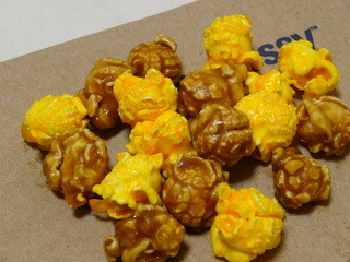 カリカリのキャラメルコーディングがされてます。けっこう甘いですが、ちょっと塩味があってほろ苦い。なんかいかにもアメリカっぽい、濃厚な味付けでした。一方チーズコーンってのは、そこまでカリカリしてません。だけど濃厚なチーズ味でとても美味しい…(^ー^)