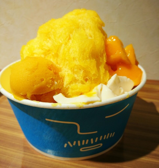 かき氷のほかに、マンゴーシャーベット、パンナコッタ、カットマンゴーが入っているのが特徴。マンゴーシャーベットは、ソルベと云っても良さそうなくらいの濃厚さ。美味しい!パンナコッタもミルク感たっぷりで粘度のある感じが良いです。