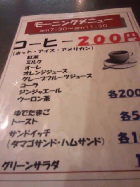 サンドイッチ・サラダ・ソーセージ・スクランブルエッグ。ここのパンが結構美味しいんですよねーー。トーストのモーニングAもあります