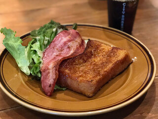 フレンチトースト!フレンチトーストの上に大きなベーコンが乗っかってて、甘いのと塩辛いのとで最高!!!こんなん大好きー♡肝心のフレンチトーストはありがちなものではなく、パンが美味しいお店だからこその美味さ。シロップもお上品な感じでじゅわっと美味。