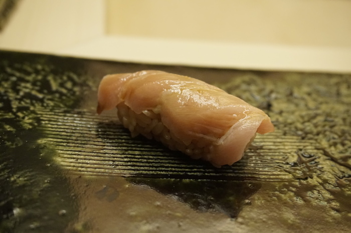 写真はぼうぜ(エボダイ)の握り。この握りには徳島の豊かさ・料理の素晴らしさが凝縮されています。