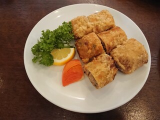 春巻は 湯葉⁉️で巻いて揚げた 中国南部のそれ ベトナム風って言うのかな⁉️ 薄皮がカリッとして美味い 特徴は 根菜類 特にゴボウがメインってこと