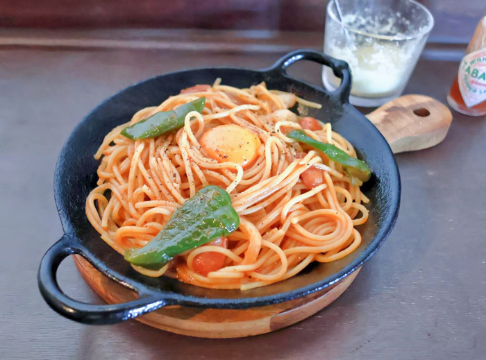 パエリア用のような鉄皿に盛りつけられたナポリタンの中央には卵の黄身がのっていました。まずは黄身を崩さずにパスタを食べると、好みの味が広がり、旨いと感じました。黄身を崩すと白身はなく、黄身だけだと分かりました。混ぜるとパスタに絡む黄身の存在感をしっかりと感じることができ、その食べ方も気に入りました。太めのパスタを使っている点も好みに合っていました。具材は玉ねぎ、ピーマン、ウインナーとシンプルですが、全体のまとまりが良く、丁寧に仕上げられた一皿だと感じました。