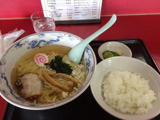 醤油ラーメンがワンコイン500円とお得。写真は醤油ラーメンに半ライス。