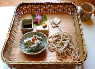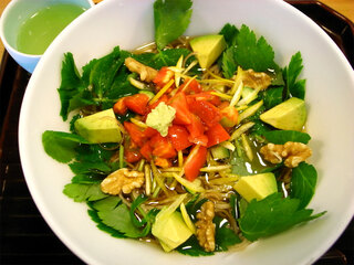 実はこれもそばなのです。「夏そば」と言いまして、手打そばに無農薬の加茂トマト・きゅうり・アボカドなどが乗っています。