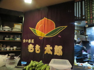「食の番屋もも太郎」と店名が書かれた暖簾がカウンター前に下がっています。